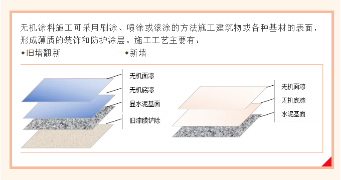 針對舊墻施工無機涂料,建議將原墻面涂裝部分完全鏟除,直至水泥墻面,再按照上面所述流程進行施工。