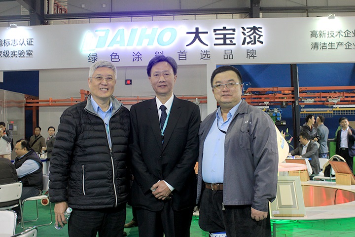 大寶國際董事長陳賀生先生(中間)與大寶化工總經理陳春華先生、大寶化工工程部劉昌屏經理(右一)于大寶漆展位合影