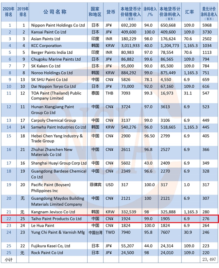 2020亞太地區涂料生產商TOP 25榜單