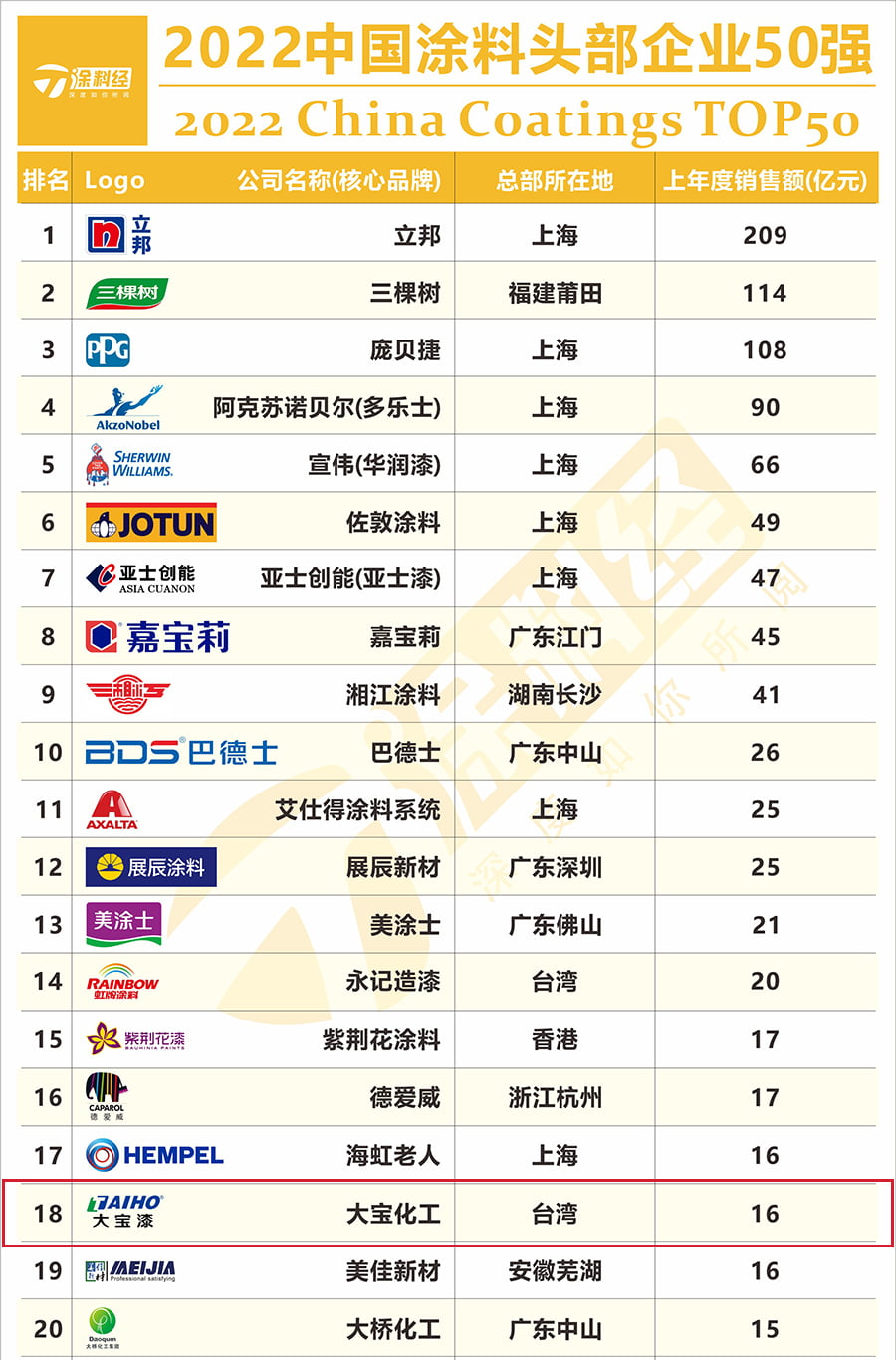 “2022中國涂料頭部企業50強”榜單的排名是依據上一年度銷售額?!爸袊苛掀髽I”,是指在中國(包括港澳臺)涂料市場上參與競爭的所有涂料企業,無論內資外資;只選取其在中國市場的銷售數據作為排行依據。