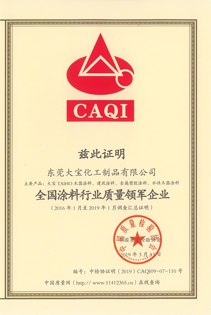 中國質檢協(xié)會通過頒發(fā)“全國涂料行業(yè)質量領軍企業(yè)”和“全國質量檢驗穩(wěn)定合格產品”證書,旨在表彰安全生產、質量管理體系健全、售后服務制度完善、有社會責任感、講誠信重質量并在行業(yè)具有廣泛代表性的優(yōu)秀企業(yè)。作為國家高新技術企業(yè),大寶漆不論是在產品質量上,還是在品牌服務、涂裝體驗都走在了行業(yè)的前列。