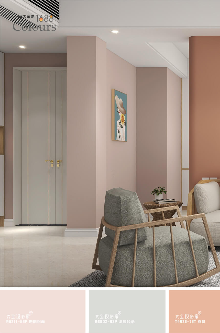 如果溫柔有顏色,那一定是莫蘭迪粉灰色(大寶R8211-89P)的暖甜。低彩度、明度的粉色,跳脫出亮粉色的鮮艷甜膩,傳遞出一種成熟優雅的韻味,從墻面到家具,搭配利落的線條和親和力十足的木質家具做點綴,讓空間保留著輕柔靜謐的氣度,極致的柔和魅力塑造起高級且質感的居家空間~