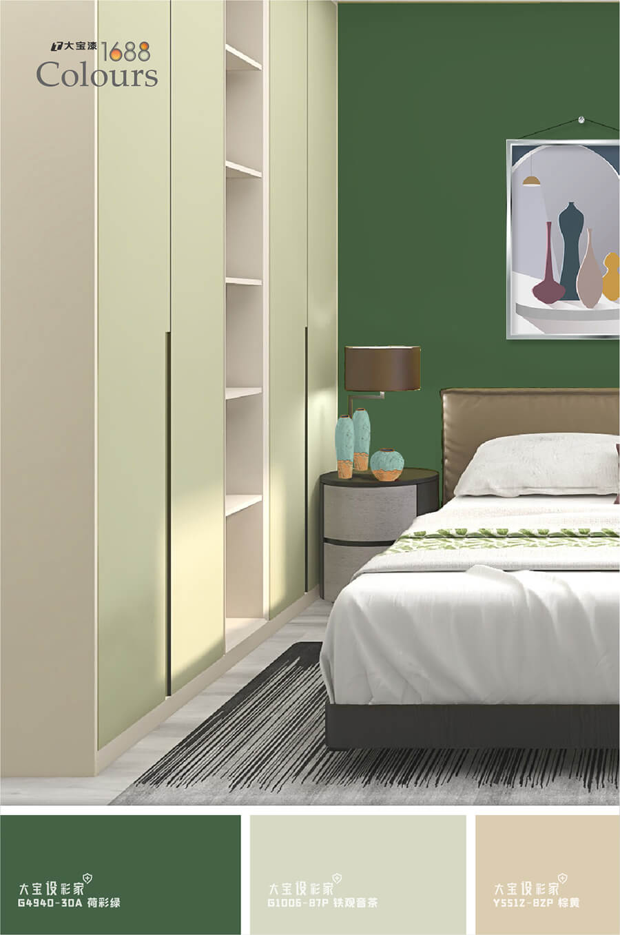 灰綠的莫蘭迪色在空間中百搭零失誤,運用在臥室空間會更舒服穩重,大寶荷采綠(G4940-30A)賞心悅目的顏色,富有治愈氣息,可以作為大量的墻面色彩使用,也可以用櫥柜、茶幾、床組等軟裝作為色彩載體進行局部性點綴,不僅可以點亮空間,還能帶來清爽自由。
