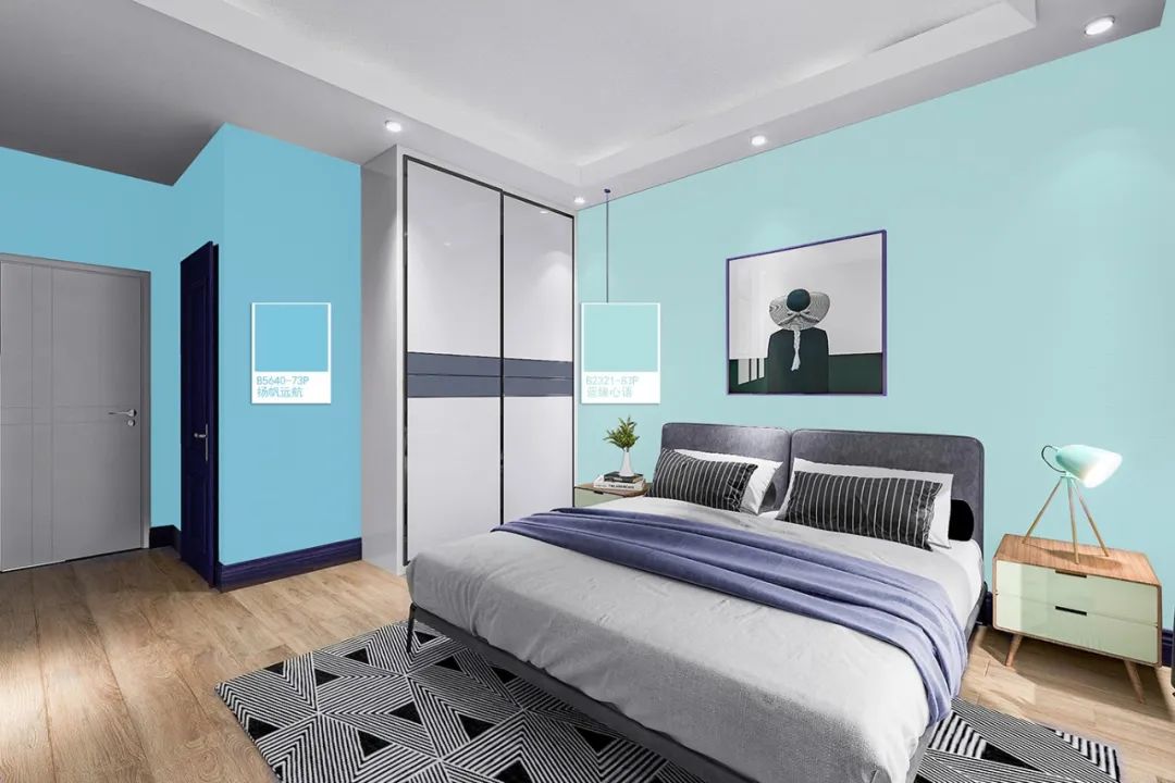 相近色也叫類似色,是運用標準色環上任何部分的45°-60°內的色。EX:黃-黃綠-綠;紅-紅橙-橙..等,均為相近色。藍綠色系不論用在何處,皆能適度提升溫柔與優雅,大寶設彩家刻意挑選純度調節到中等程度的B5640-73P揚帆遠航,是一淡化過后的藍色,飽和度低、明度高,搭配起來能帶給人寧靜平和的感受。當然選色處理得當,色感也更加豐富,相似色組合搭配能表達在維持原有風格的同時,讓空間視覺更有層次感。